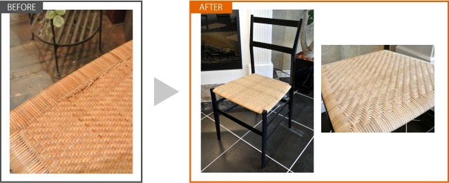 デザイン性とともに快適な座り心地を与えてくれる籐の座面の手編み技術は、現在では大変貴重と言われています。 今回は、たわんでしまった座面を熟練の籐職人の手によりきっちりと編み直し、 この不朽の名作にまた命が吹き込まれました。
